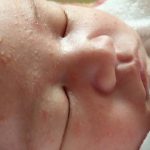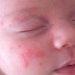 Пищевая аллергия на смесь (фото 2) имеет разное проявление. От неподходящего питания сыпь может образоваться на любом участке. Покрасневшие щеки становятся блестящими, иногда покрываются неприятными корочками. Это один из самых первых признаков, который вызывает аллергия у новорожденных на питание, к которому позже присоединяются и другие.