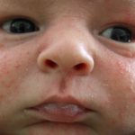 Аллергия на молочную смесь проявляется, прежде всего, высыпаниями на щечках, животе, попе, даже на слизистой рта и волосистой части головы.
