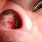 Герпес в носу появляется так же часто, как и на его поверхности. Простуда в носу начинается с неприятного зуда и припухлости. Выглядит герпес в носу (см. фото 3) как небольшой бугорок ярко-красного цвета, покрытый гнойными бляшками. Простуда в носу изнутри может быть и не видна, но человек постоянно ощущает сильную боль при прикосновении даже с внешней стороны.